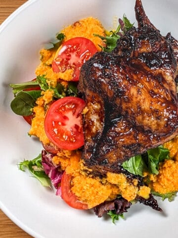 First, the Grilled Zhug Ras el Hanout Lamb Chops and Tomato Salad packs a punch with Middle Eastern spices like zhug and Ras el Hanout, perfectly complementing the juicy, grilled lamb chops. Served alongside a refreshing tomato salad, this dish is an easy win for a grain-free dinner that feels indulgent. Next, the Grilled Pork Chops with Tamarind Habanero Glaze and Coleslaw bring together sweet, tangy tamarind with the fiery kick of habanero to create a glaze that elevates your pork chops to another level. Paired with a vinegary coleslaw, this meal offers a balanced mix of heat and acidity, without the need for grains.
