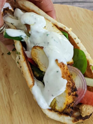 • zhug feta hummus chicken wrap on a bamboo plate and folded in hand