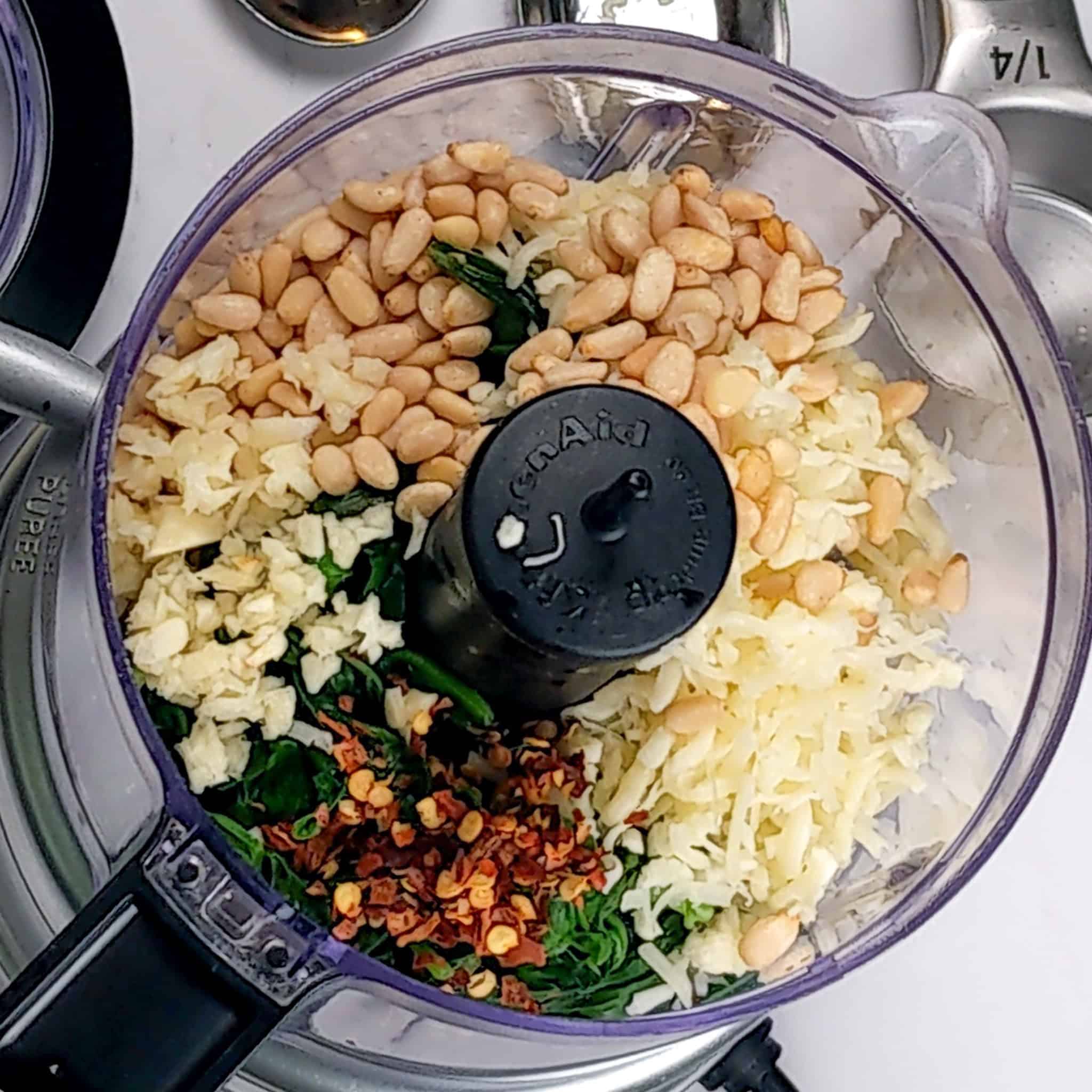 - Prepare the Spinach Pesto: Combine the (blanched) spinach, basil leaves, parmesan cheese, toasted pine nuts, garlic, and red pepper flakes in a food processor. Then, slowly drizzle in the olive oil with the processor running until the mixture is smooth and well combined into a paste.