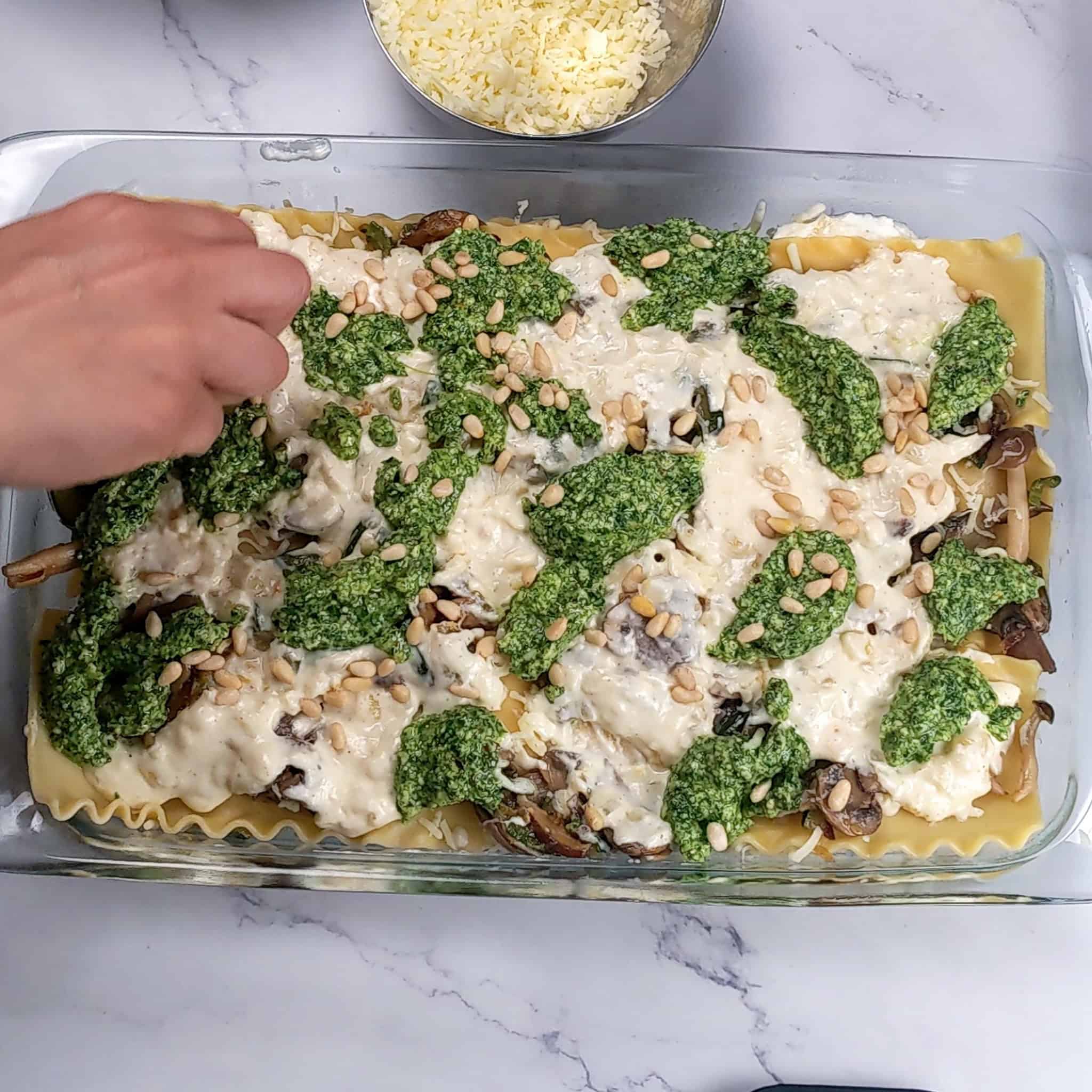A lasagna pasta dish layered with creamy onion garlic sauce, a meaty mixture of mushrooms and zucchini, topped with shredded Italian cheese blend and ricotta cheese, and then topped with a refreshing, spicy spinach and basil pesto sauce and crunchy pine nuts for the best vegetarian lasagna recipe.
