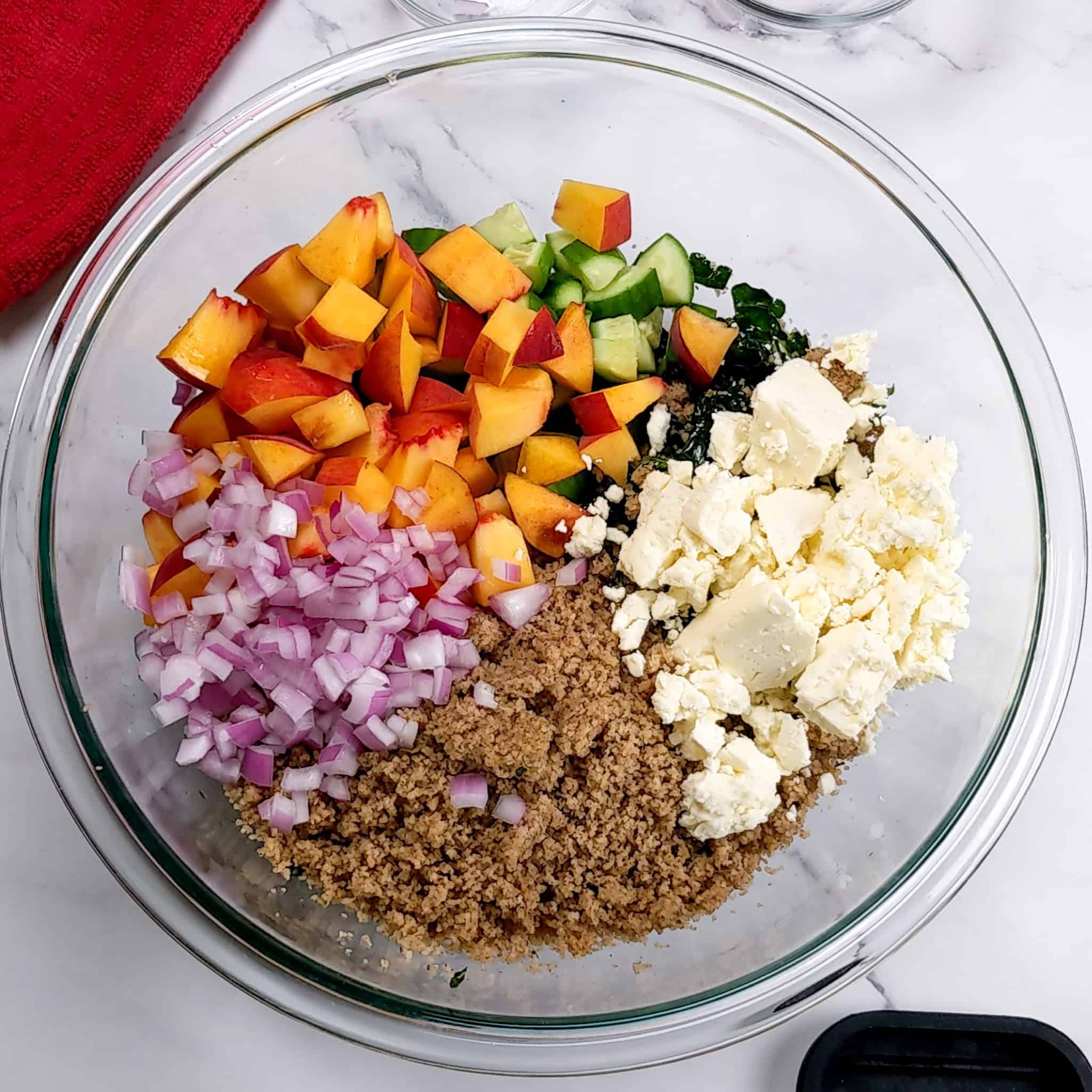 - Prepare the Salad: Add the cooled fonio, diced cucumber, peach, thinly sliced red onion, and crumbled feta or goat cheese in the bowl in the massaged kale. Pour the peach basil vinaigrette over the salad and toss to combine. Set aside, allowing the ingredients to meld.