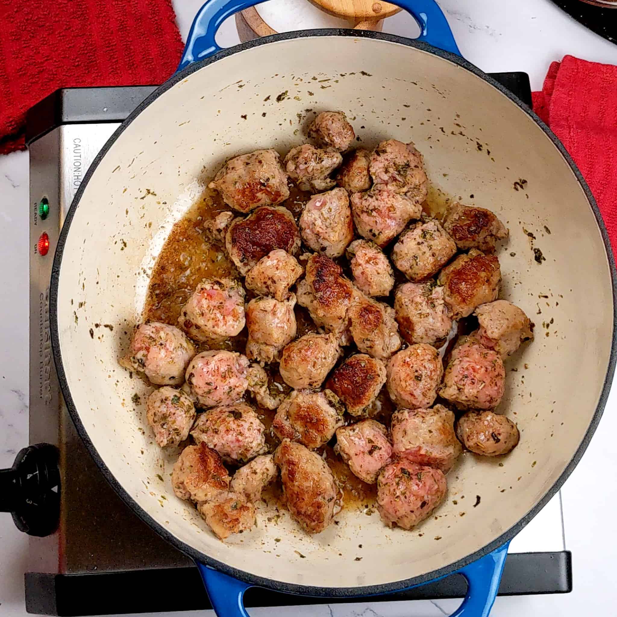 Brown the sausage chunks to caramelize them to bring out a rich flavor.