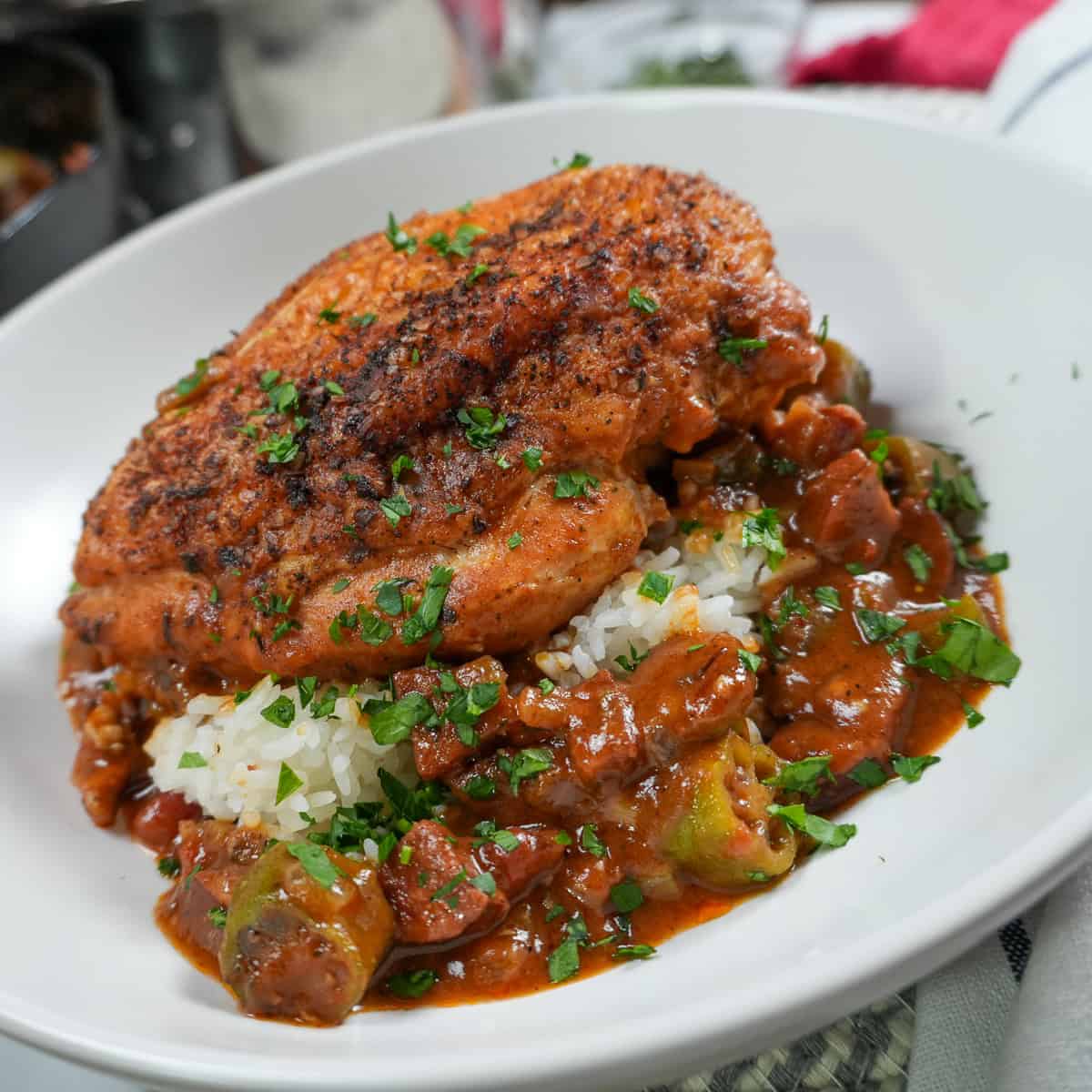 Serve: Spoon jasmine rice onto plates. Place the whole roasted chicken breast on top. Ladle the gumbo-style sauce generously over the chicken. Garnish with parsley or green onions.